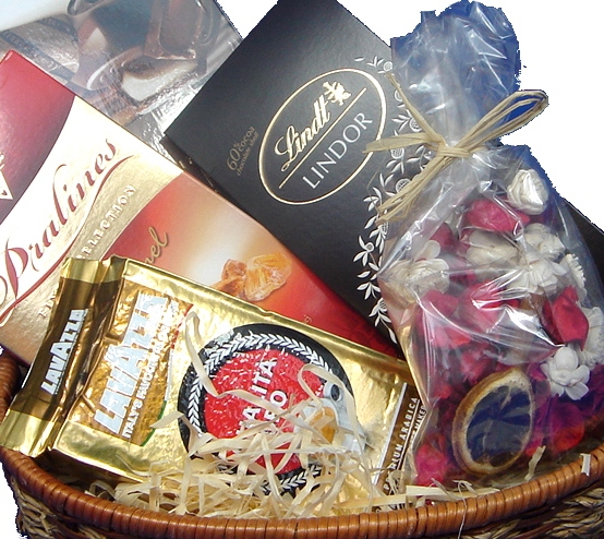 Lalibelle , czekoladki mleczne, nadziewane, w 6 smakach ( migdałowym, advocat, toffi, kokos, tiramisu, irish coffee , 119 gr. Lindor , czekoladowe praliny z delikatnie rozpływającym się nadzieniem, 100 gr. Lavazza qualita oro, kawa mielona, 250 gr. Pralines, praliny z czekolady mlecznej i deserowej z kremem o smaku karmelowym, 112 gr. Potpourri z cynamonem i plastrem pomarańczy . Wypełnienie struganym drewnem.
