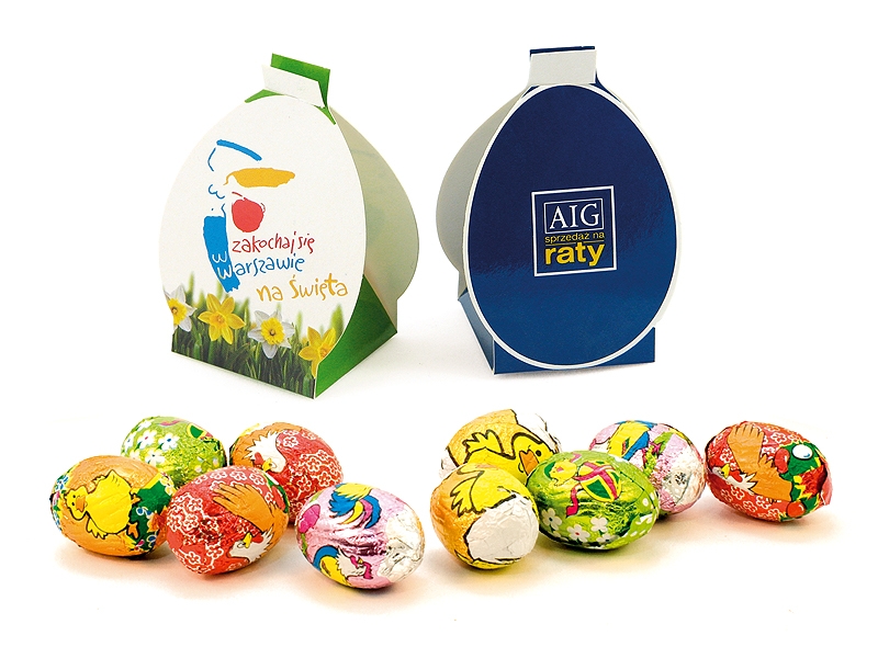 Czekoladki w różnych smakach i kształtach, pakowane pojedynczo w pudełeczka z zamknięciem w kształcie jajka. Możliwość drukowania logo, nazwy, tekstu na pudełku. Idealne rozwiązanie pod imprezę firmową, targi, wystawy, miejsca kontaktu z klientem.