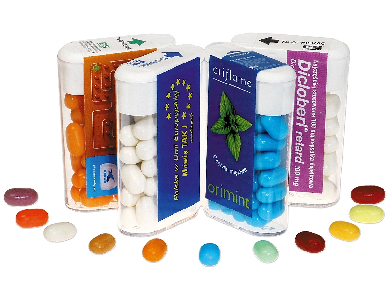 Drażetki miętowe lub owocowe, w pudełeczku z przezroczystego PCV. Pudełeczko oklejone z obu stron etykietą reklamową. Różne smaki i kolory. Idealne rozwiązanie pod imprezę firmową, targi, wystawy, miejsca kontaktu z klientem, gadżet.