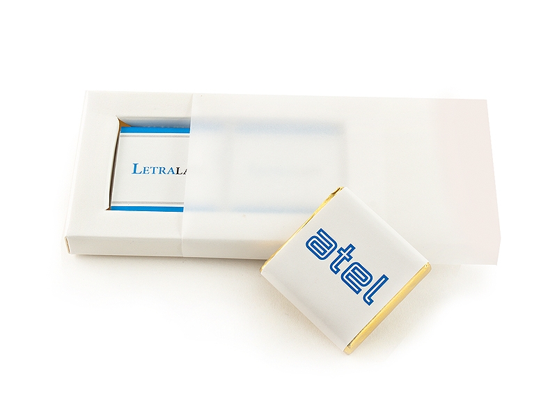 Dwie belgijskie czekoladki w pudełku kartonowym z półprzezroczystą kalką techniczną. Ułożone w kartoniku białym, złotym lub srebrnym. Możliwość drukowania logo, nazwy, tekstu . Idealne rozwiązanie pod imprezę firmową, targi, wystawy, miejsca kontaktu z klientem.