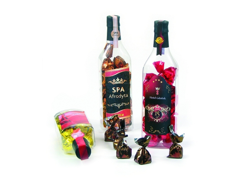 Butelka z wysoko przezroczystej folii PET, wypełniona markowymi czekoladkami z nadzieniem. Kolory opakowania cukierków zależne do smaku ( złoty- advocat, jasny brązowy – rum, ciemny brąz – brandy, czerwony – wiśnia w likierze) .Możliwość tworzenia na etykiecie, napisów, motywów graficznych, loga. Idealne rozwiązanie pod imprezę firmową, targi, wystawy, miejsca kontaktu z klientem, dla Kontrahentów.