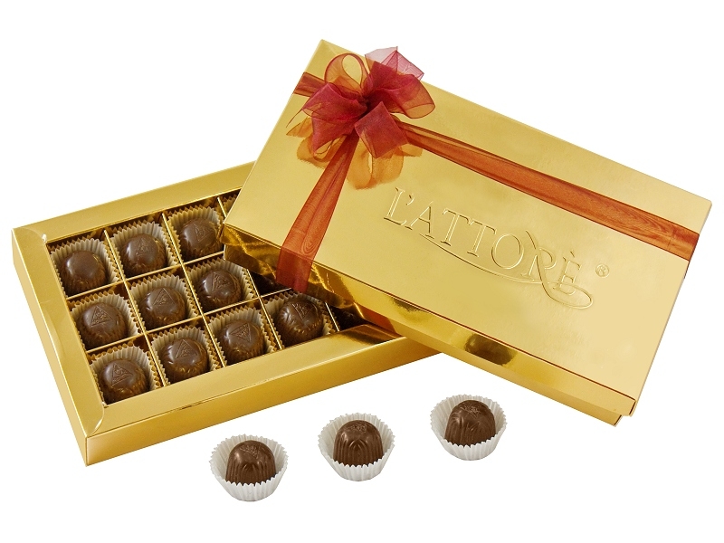 18 czekoladowych pralin z aksamitnym kremem o kilku smakach do wyboru. Ułożone w złotym opakowaniu z tłoczeniem. Dostępne również w opakowaniach z kartonu: srebrnego, srebrnego holograficznego. Całość przewiązana kokardą- kilkanaście kolorów do wyboru. Idealne rozwiązanie pod imprezę firmową, targi, wystawy, miejsca kontaktu z klientem, dla Kontrahentów.