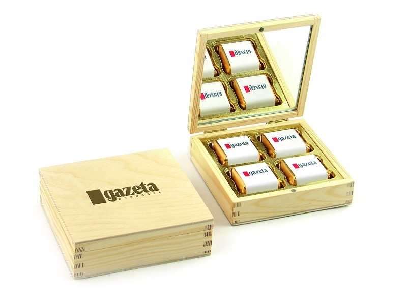 Cztery czekoladki mleczne z delikatnym, alkoholizowanym kremem w szkatułce z naturalnego drewna. Czekoladki zawinięte w srebrny laminat i obwoluty reklamowe z nadrukiem. Ułożone w złotej wyprasce. Indywidualna personalizacja na wierzchu szkatułki, wykonana techniką graweru. Lusterko umieszczone po wewnętrznej stronie wieczka. Idealne rozwiązanie pod imprezę firmową, targi, wystawy, miejsca kontaktu z klientem, dla Kontrahentów.