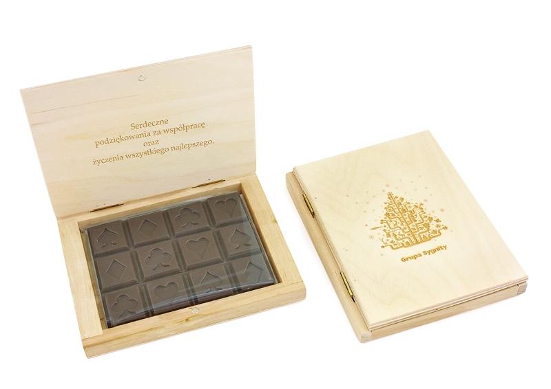 Czekolady mleczne lub deserowe z wytłoczonymi motywami z kart do gry. Czekolady zapakowane w torebki w folii przezroczystej i eleganckie opakowanie drewniane. Dwustronna personalizacja laserowa – także imienna – wykonywana już od 1 egzemplarza. Idealne rozwiązanie pod imprezę firmową, targi, wystawy, miejsca kontaktu z klientem, dla Kontrahentów.