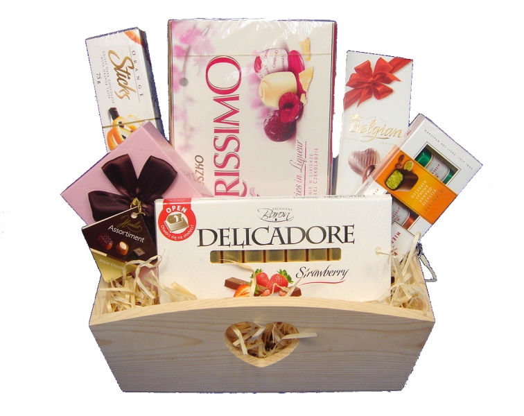 Cherrissimo, wiśnie w likierze, w białej czekoladzie, 135 gr. Paluszki czekoladowe , o smaku pomarańczy , 75 gr. Belgijskie czekoladki w kształcie serca, 65 gr. Marcepan z pistacją, pomarańcza, ananasem, espresso w czekoladzie pół gorzkiej, 100 gr.