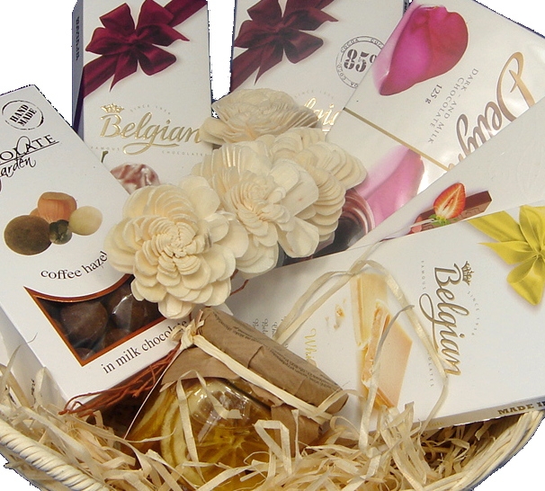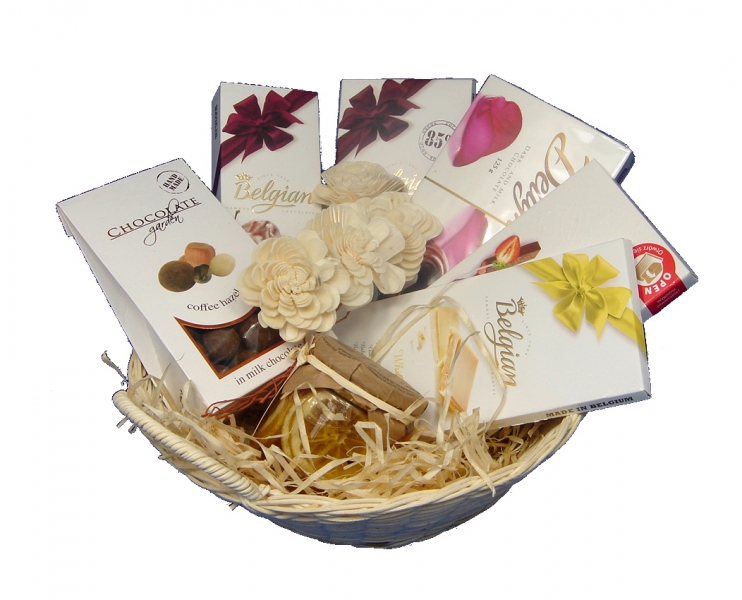 Belgijska biała czekolada, 100 gr. Podwójne precle z czekolady deserowej i mlecznej, 125 gr. Delicadore, batoniki mleczne z nadzieniem o smaku truskawkowym, 200 gr. Belgijska ciemna czekolada, zawierająca 85% kakao, 100 gr. Orzechy laskowe w czekoladzie mlecznej z kawą, 125 gr. Belgijskie trufinki wiśniowe w czekoladzie, 65 gr. Pomarańcze w syropie do herbaty, napojów, drinków, i deserów, 230gr. Wykończenie florystyczne zaprojektowane przez Studentki ASP Katowice. Kosz do wysyłki pakowany jest w ozdobny celofan.